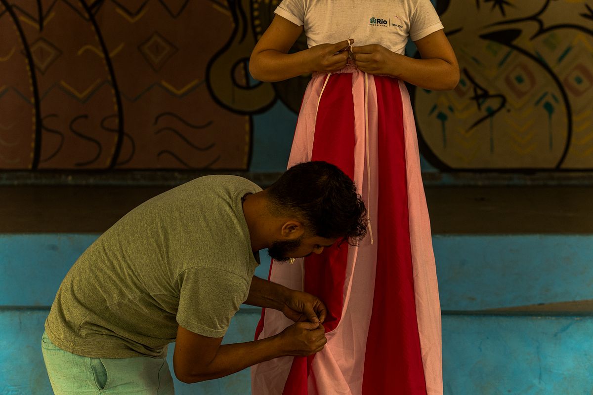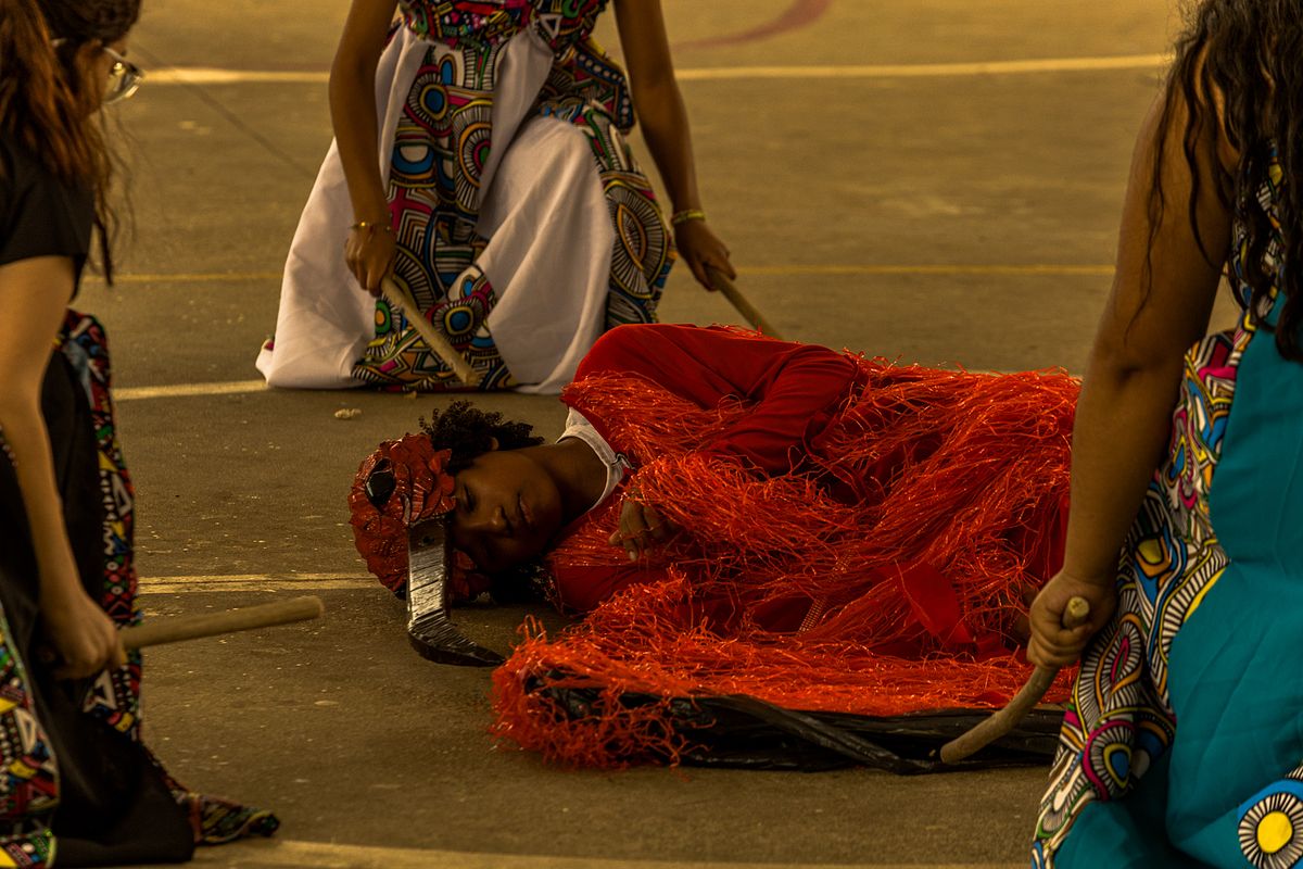 A quadra azul da escola se fez palco de uma sinfonia de cores e corpos. O olhar que fotografa organiza o caos dos gestos em composição, como se cada dobra de tecido fosse uma linha de horizonte. O vermelho arde contra o azul das paredes, o verde se expande como mata recém-nascida, o dourado repousa nos cabelos e coroas, criando um jogo cromático onde a vida pulsa em excesso e, por isso mesmo, se revela como arte.